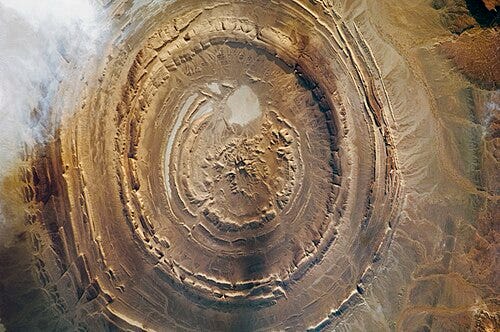 The Richot Structure in Mauritania, (northwest region) is an example of an unusual desert landform. The name means feathers. However, locals call it tagense, a circular opening of a leather pouch used to draw water from nearby wells.